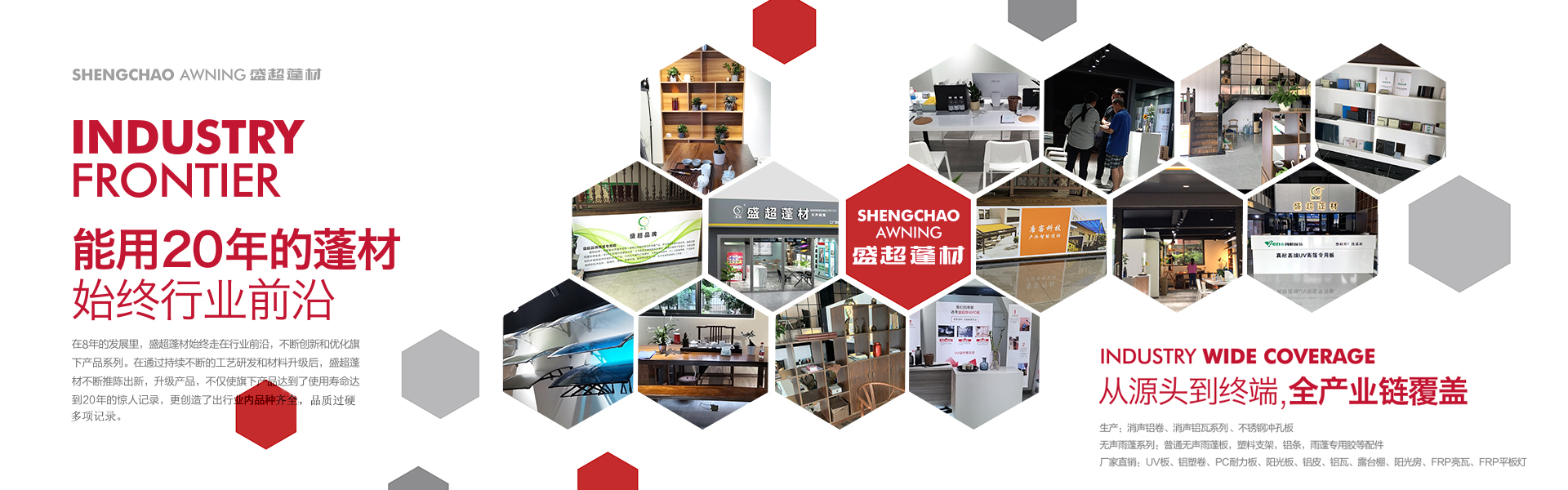 盛超蓬材是由四川超諾商貿(mào)有限公司創(chuàng)辦,是一家集研發(fā)、生產(chǎn)、銷(xiāo)售和服務(wù)于一體的專(zhuān)業(yè)雨蓬供應(yīng)商。主要產(chǎn)品:實(shí)心耐力板,中空陽(yáng)光板、多層板、蜂窩板、鋁瓦、消聲鋁瓦、不銹鋼消聲等材料的雨蓬產(chǎn)品。自主研發(fā)多款雨蓬,擁有自己的專(zhuān)利和檢測(cè)報(bào)告。其中明星產(chǎn)品新型組裝式雨蓬,擁有組裝簡(jiǎn)便,美觀(guān)耐用、抗噪音,性?xún)r(jià)比高等優(yōu)勢(shì),多項(xiàng)檢測(cè)指標(biāo)領(lǐng)跑同行業(yè)。受到了市場(chǎng)和經(jīng)銷(xiāo)商的高度認(rèn)可。 公司自成立至今,從銷(xiāo)售到研發(fā)再到生產(chǎn),已經(jīng)過(guò)了3次跨越式的發(fā)展。2017年已成為四川雨蓬行業(yè)內(nèi)庫(kù)房面積大,員工多的一家公司。產(chǎn)值每年以平均20%的速度快速增長(zhǎng)??梢哉f(shuō)客戶(hù)是我們的老師,和他們合作使我們得到很多的學(xué)習(xí)機(jī)會(huì)來(lái)提高自身的技術(shù)水平和管理水平,是我們生產(chǎn)和發(fā)展的動(dòng)力。